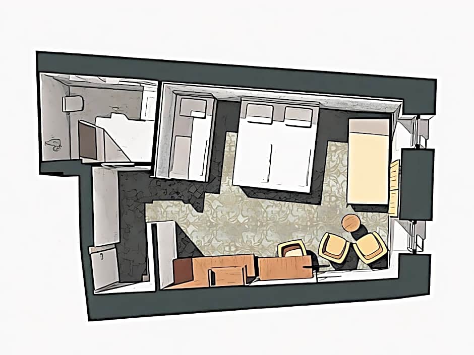 This family room consists of 2 connecting bedrooms with a common entrance hall. One bedroom is equipped with a double bed, the other with a single bed and both rooms offer a small bathroom with a shower. The double-bed room has a sloping roof, the single-bed room has no view.